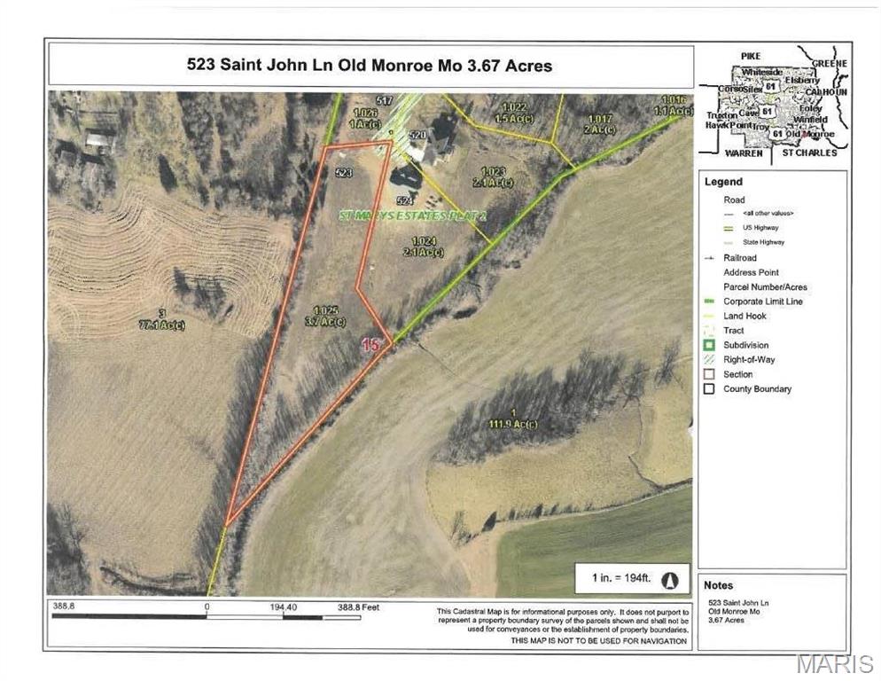 This is your chance to build your dream home and secure your slice of the American dream in a serene, picturesque setting. Discover the perfect 3.67-acre parcel in Old Monroe, nestled in the unincorporated area of Lincoln County. This prime location in a private cul-de-sac offers a homesite with private countryside views, ready for your custom builder and plans. Tree lined. All essential utilities, including gas, electric, water, and sewer, are available, and the property features concrete streets for easy access. Just Minutes from O'Fallon, St. Peters , Hwy 79 and 64 Corridor. House minimums:Ranch 1700, 2 sty: 2000 , Multi Levels:1200 sq ft